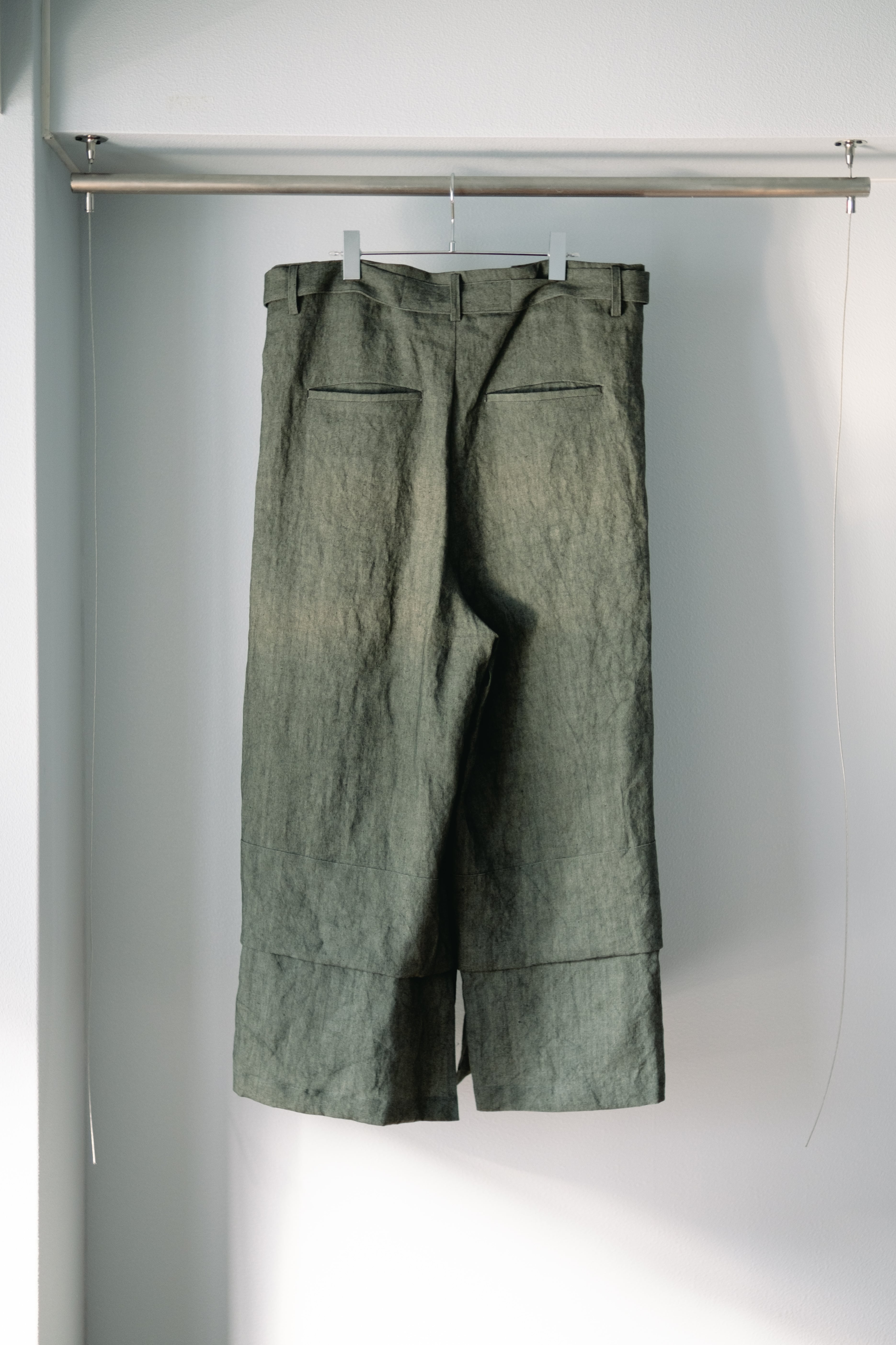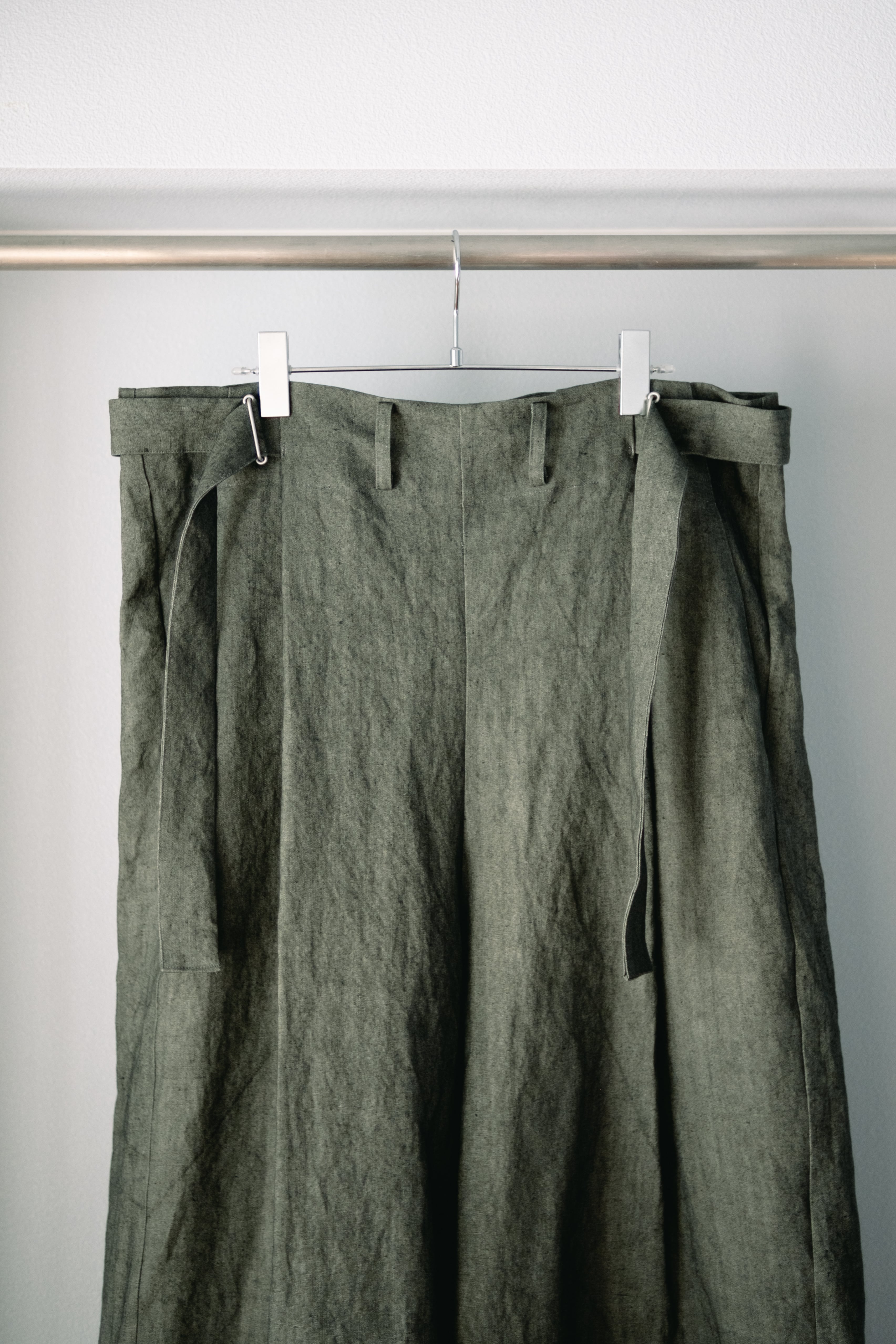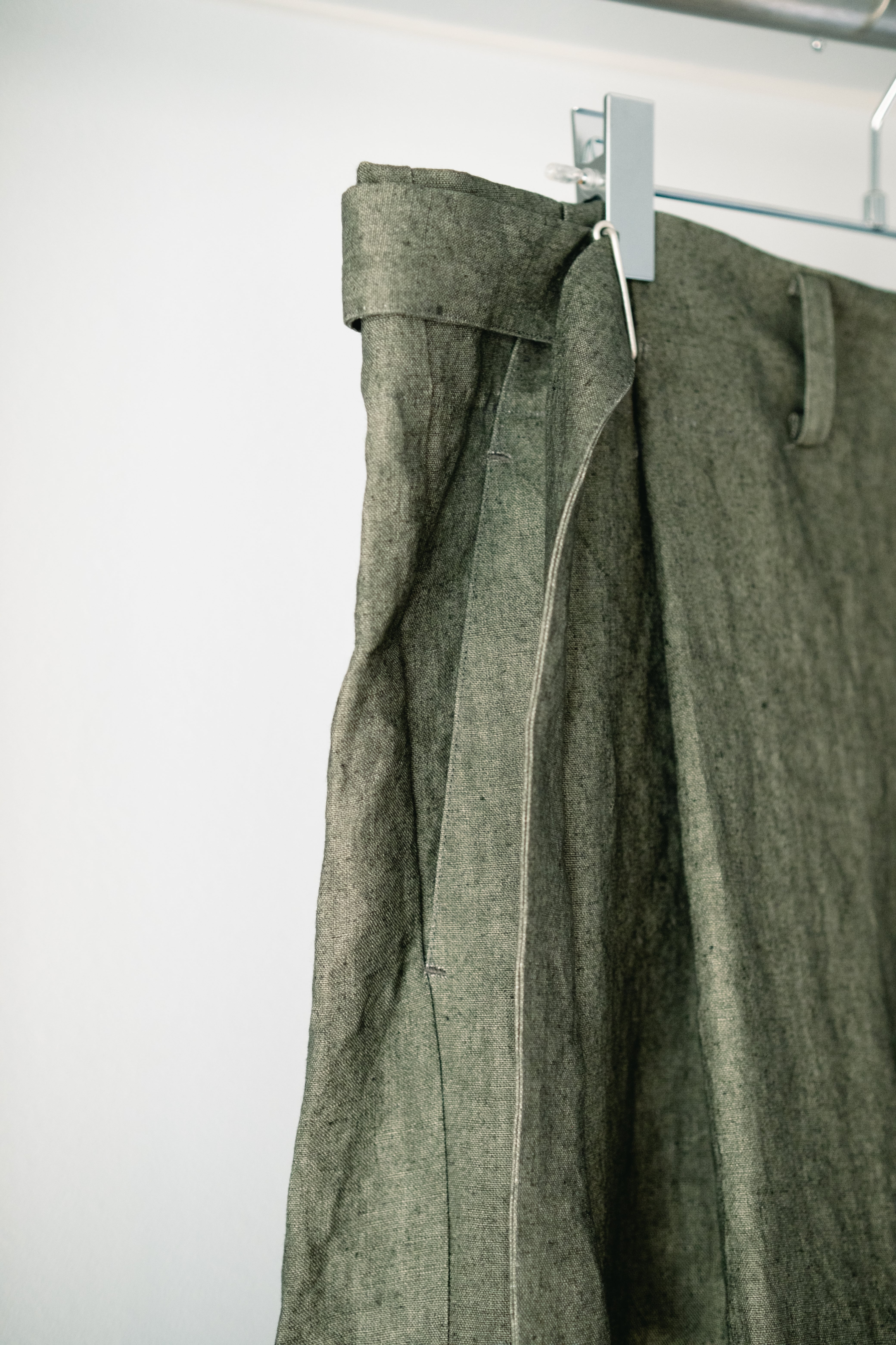 名前の通りフロントからファスナーやボタンをなくし、素材が生み出す魅力を最大に楽しんでもらえるようデザインしたパンツです。フロントの左右のタックで生まれる生地のドレープや、左右のベルトで腰回りを絞ることのできるイージー感。