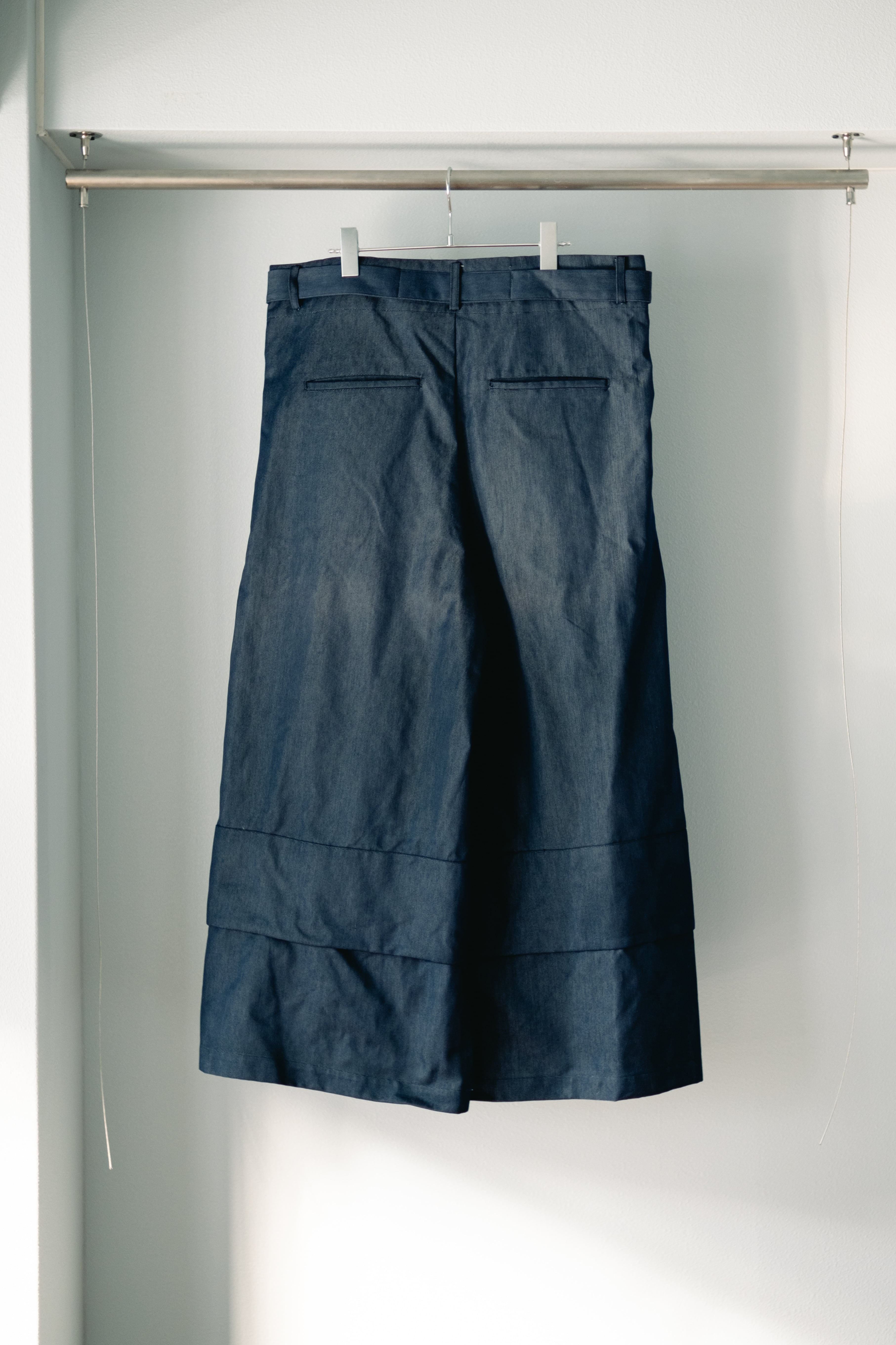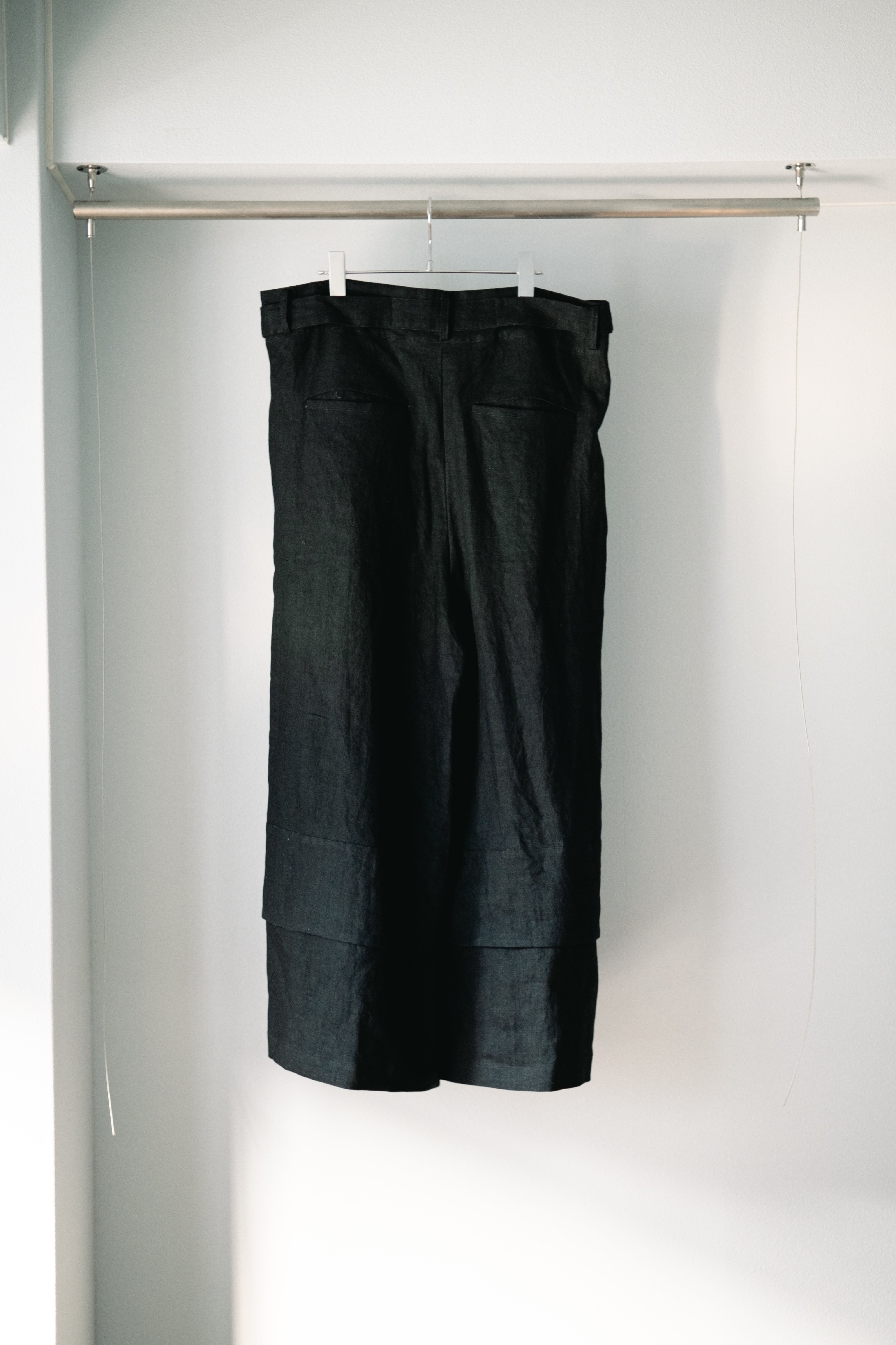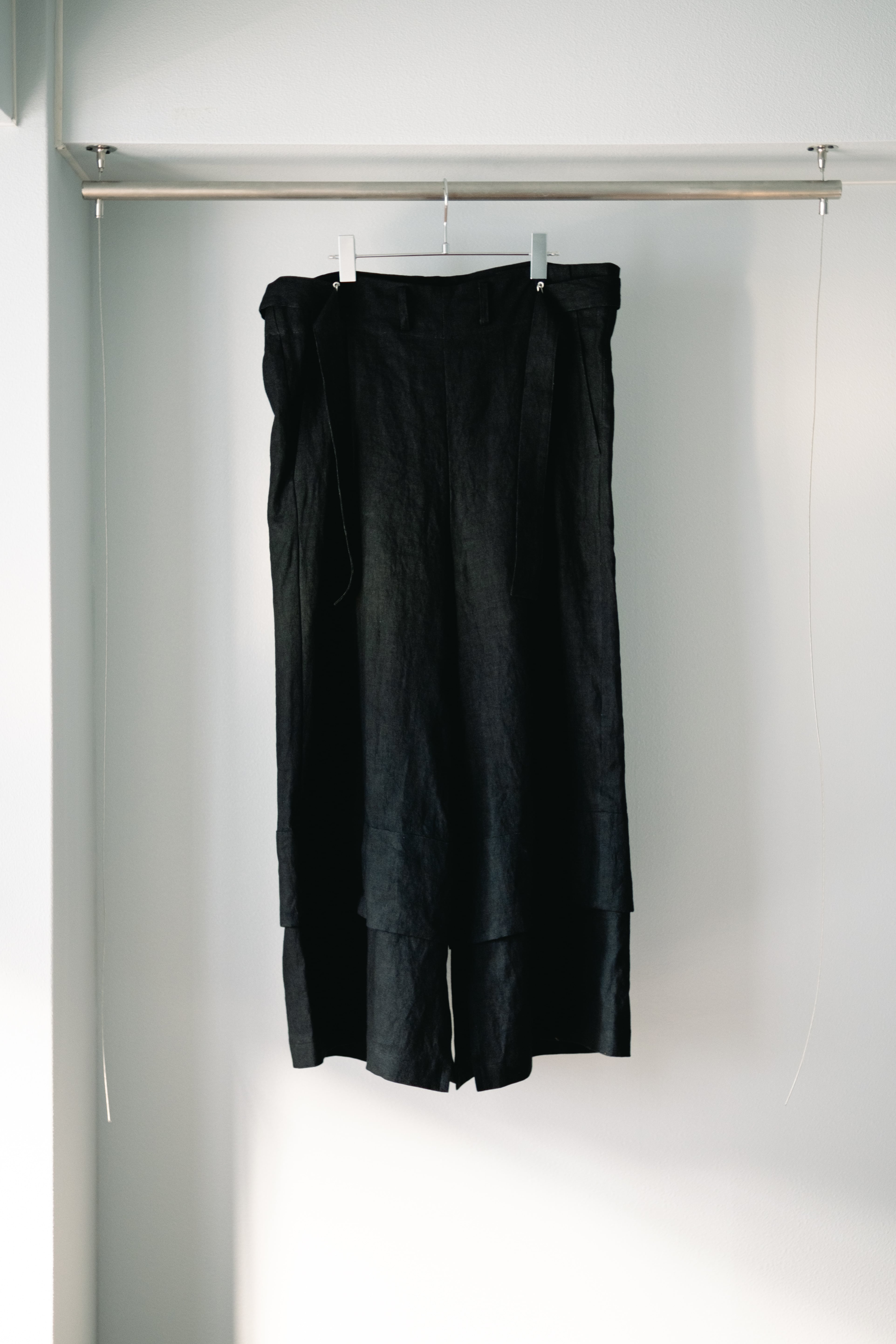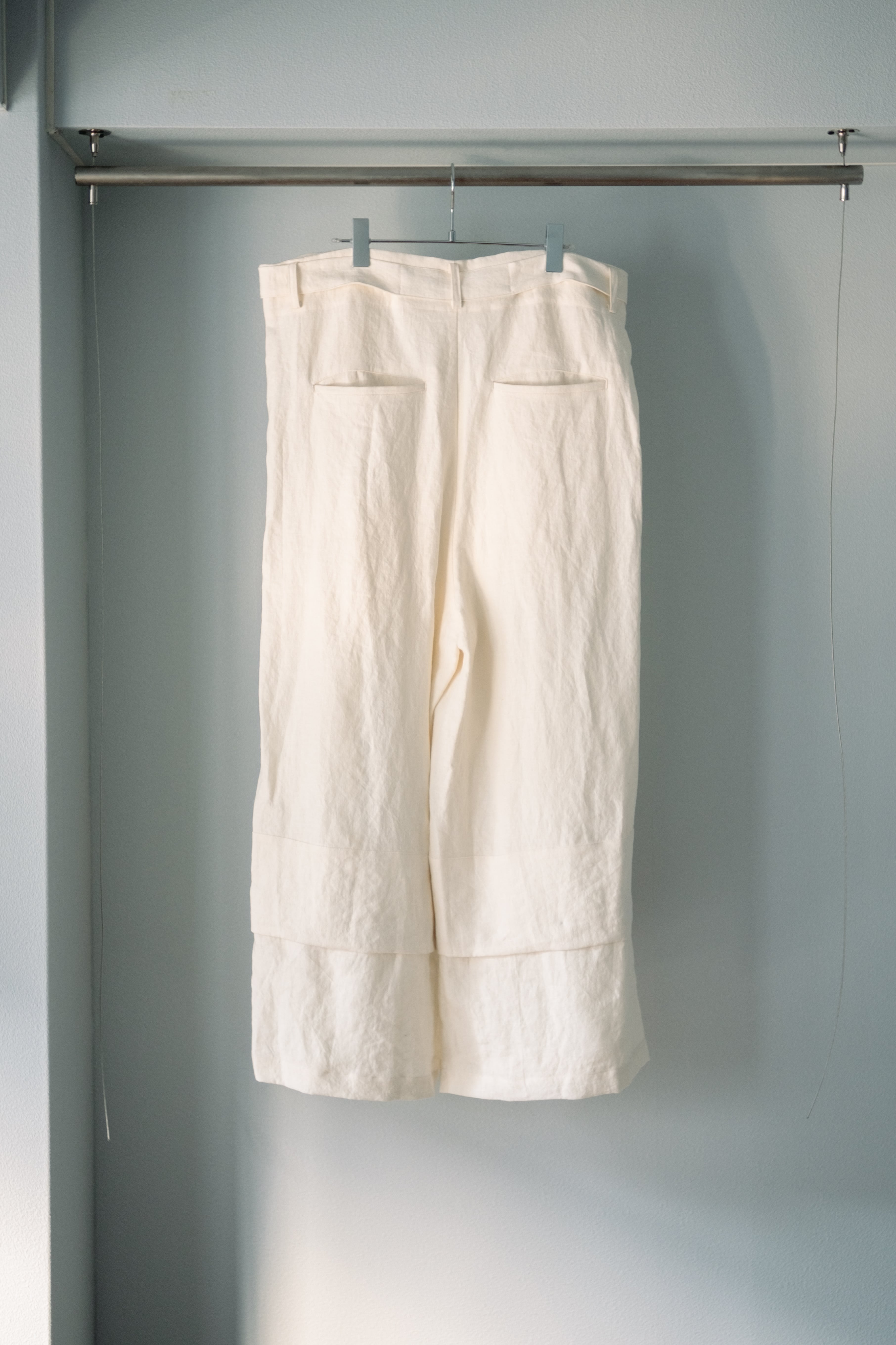 名前の通りフロントからファスナーやボタンをなくし、素材が生み出す魅力を最大に楽しんでもらえるようデザインしたパンツです。フロントの左右のタックで生まれる生地のドレープや、左右のベルトで腰回りを絞ることのできるイージー感。