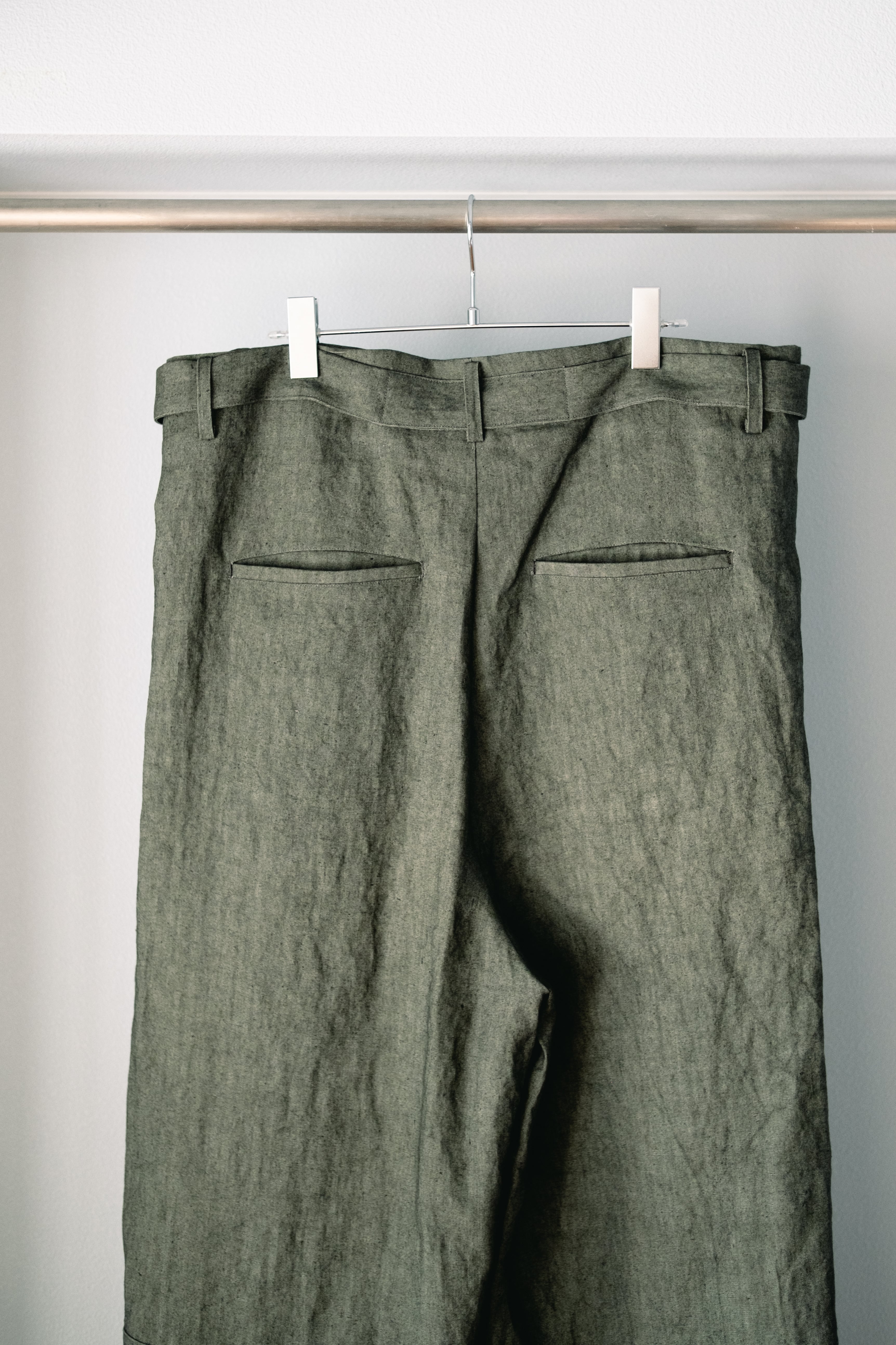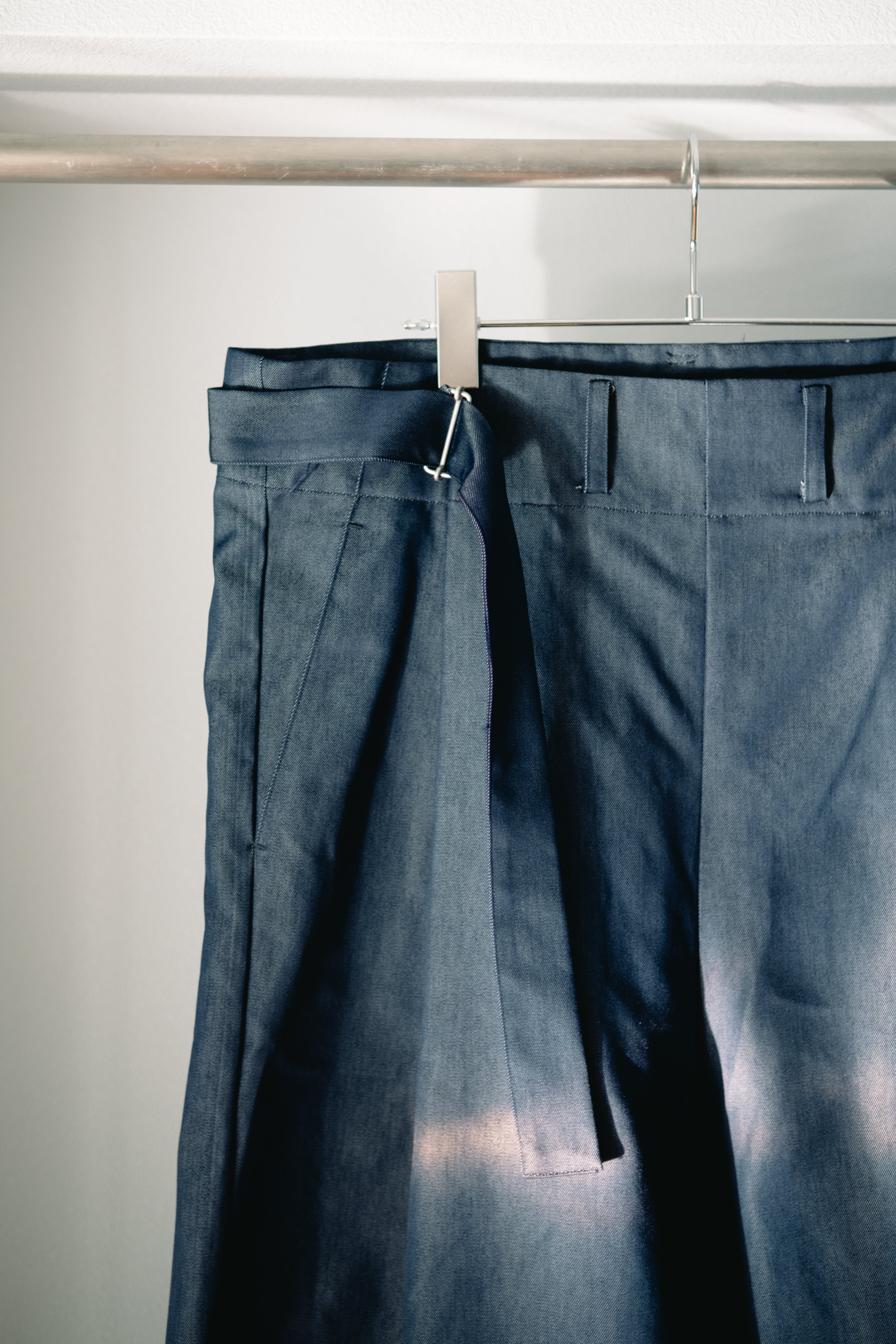 フロント左右のタック上部のウエストベルト付近に備えたアジャストバックルを使い、バックセンターに縫い留めたベルトを左右で絞ることでベルト無しで着用可能。