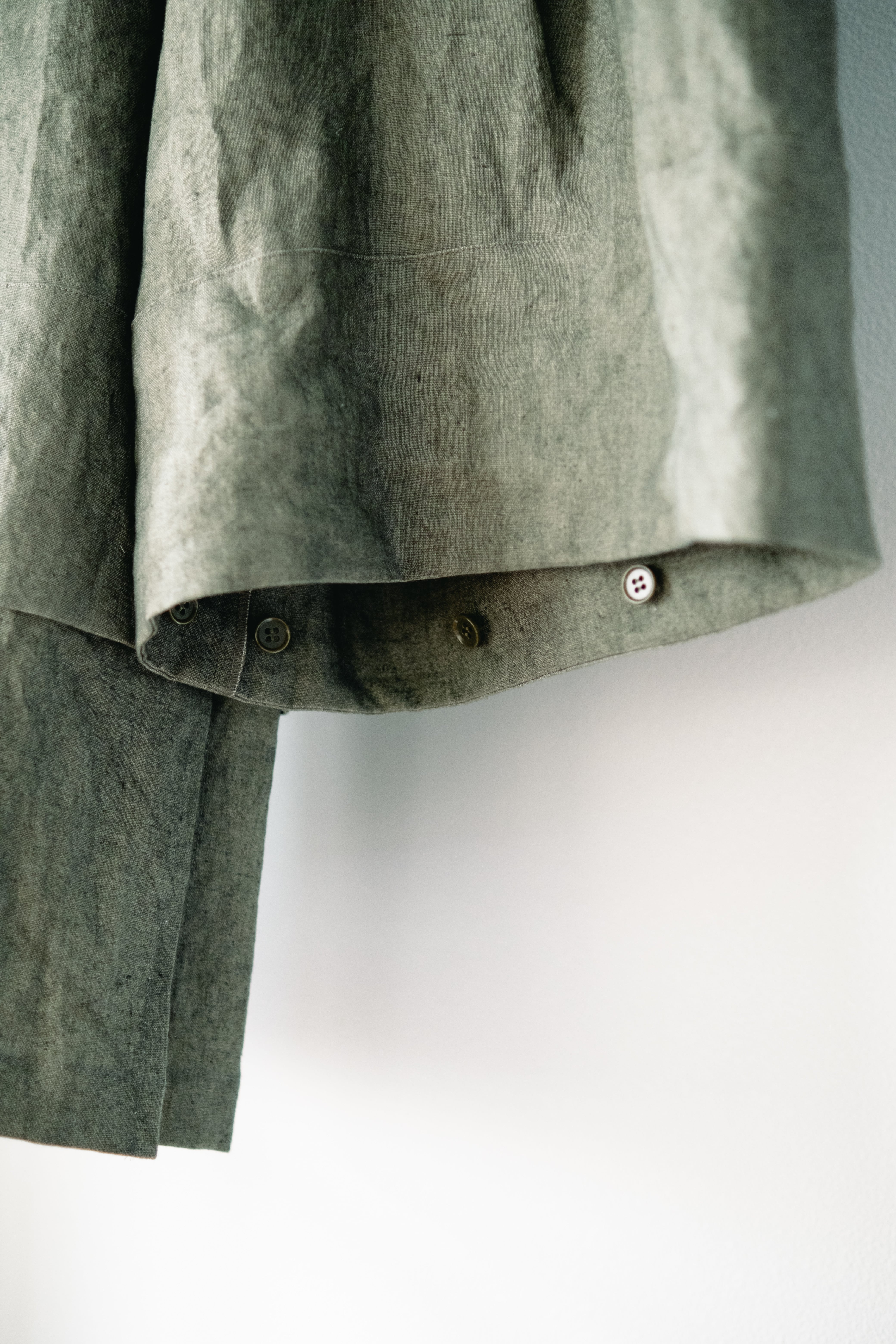 裾は幅広の見返し仕立てになっており丈夫さを兼ね添えつつ、裏面に別パーツの脱着用ボタンが片足18個付けてあります。(上段と下段に9個ずつ)