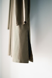 一番の特徴の首周りはボディとの切り替えにV字を深くすることで短調に感じないように立体的に設計。色違いで揃えたくなるデイリーユースな服を作りました。