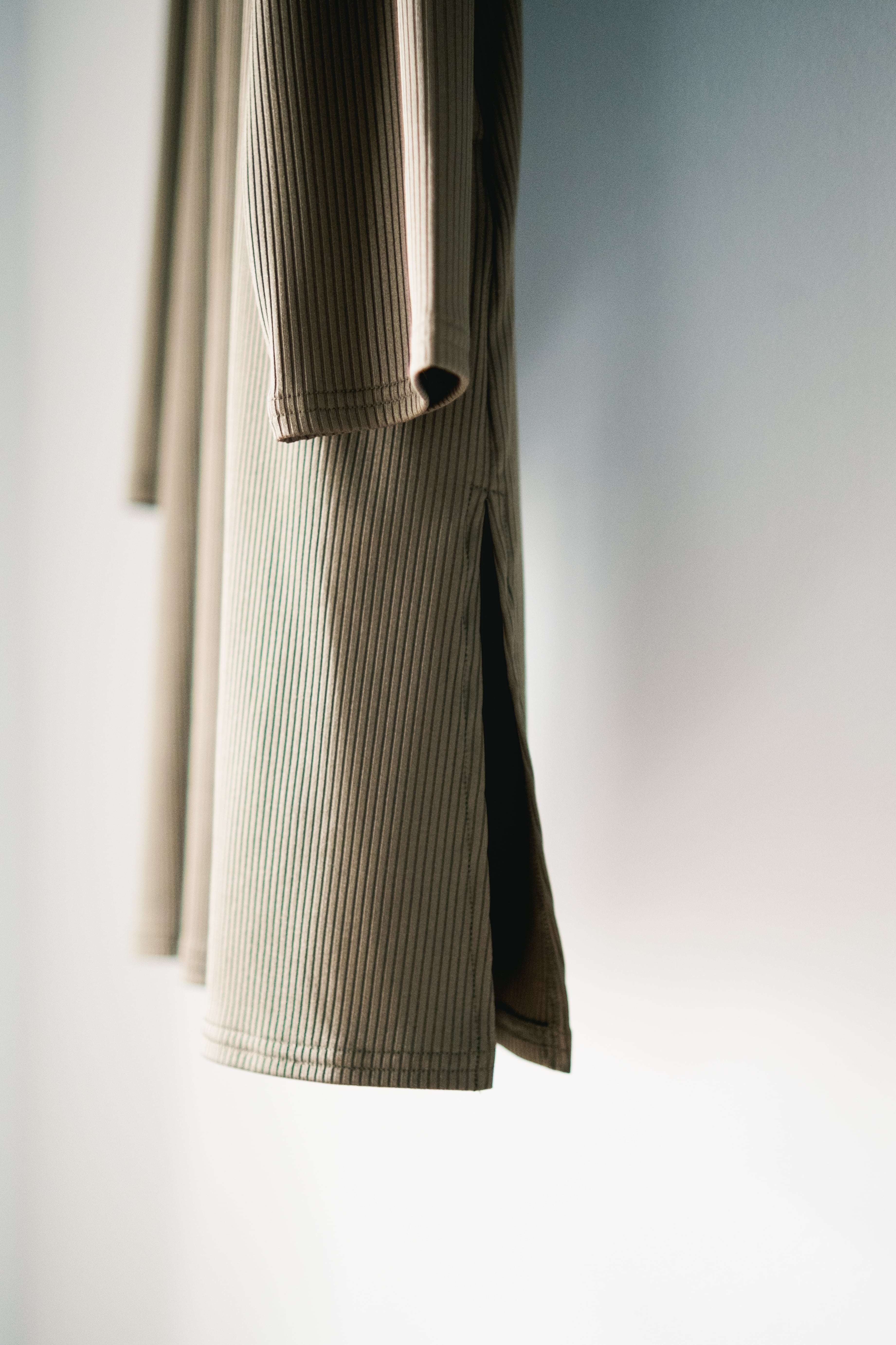 リブ編みで伸縮性の良いストレッチジャージ素材。1枚でもカジュアルになりすぎない少し光沢の感じる原料を使用した素材です。
