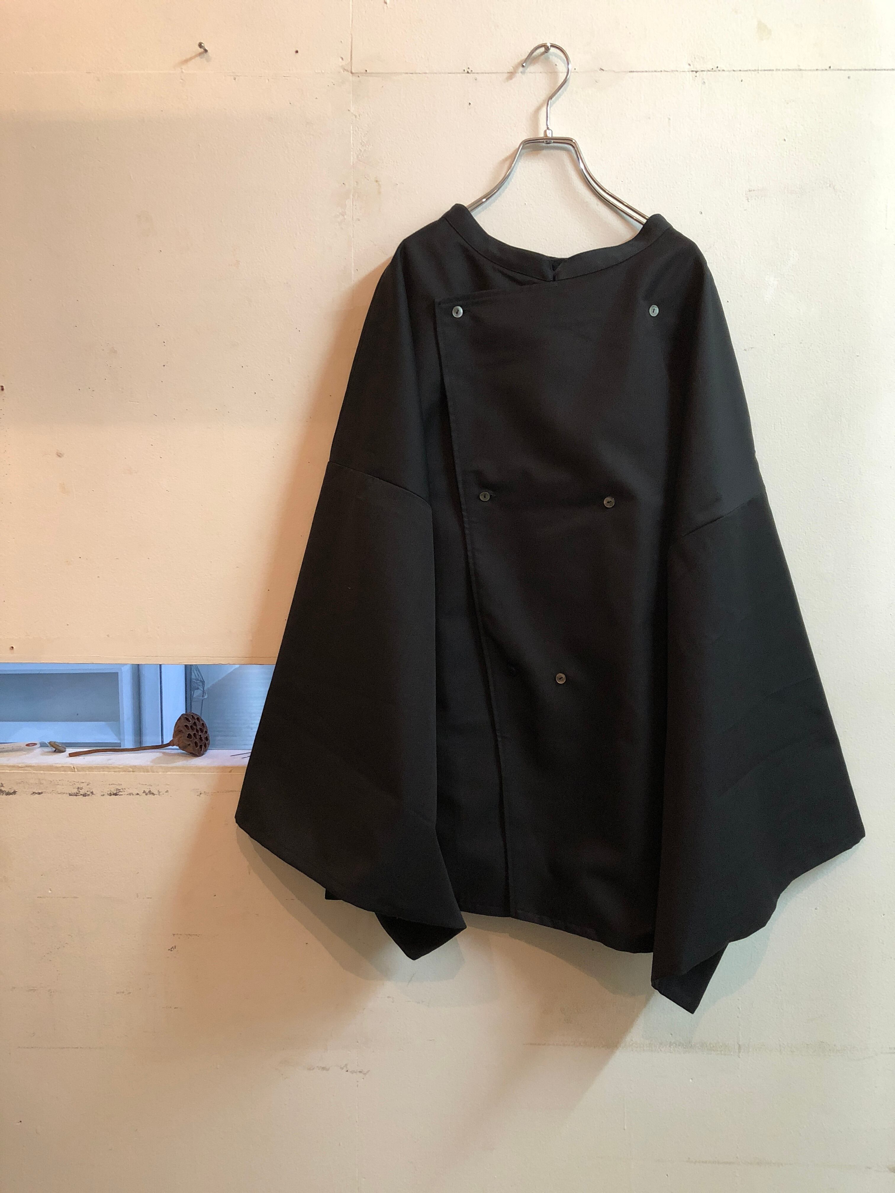 前後がない服となります。前はダブル開きにでき、打掛ボタンもあります。後ろはシャツのようなボタンダウン。台襟だけあるデザインになっていて、袖ありは和装の角袖のように作り、袖に物が入れることができます。