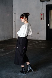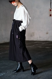 ・ハイウエスト部分にドローコードがあり、絞ってシルエット変更可能。