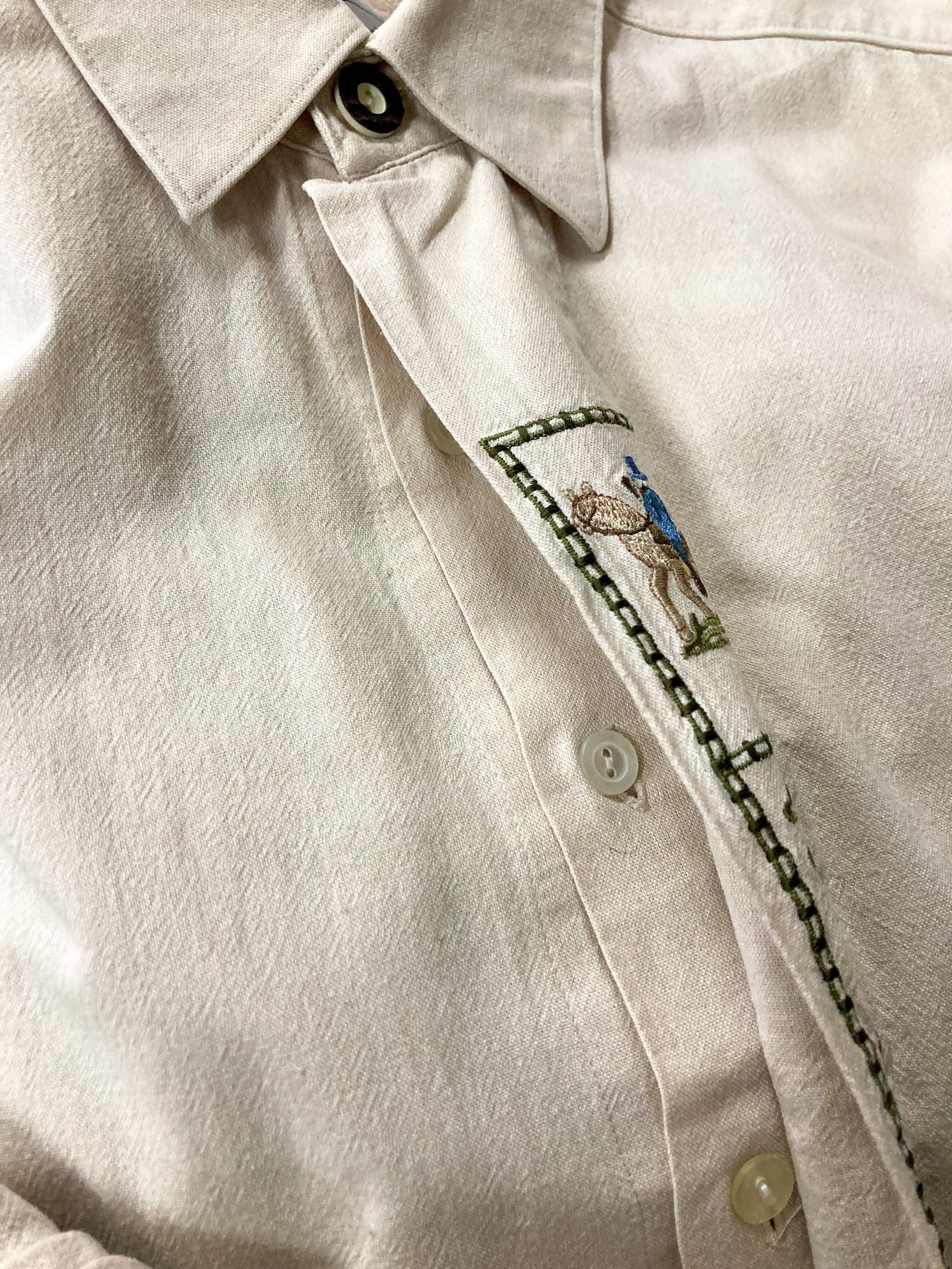 こちらは割とシンプルめで取り入れやすいタイプです。刺繍はシンプルとはいえデザインが面白く、ボタンも定番の鹿の角。
