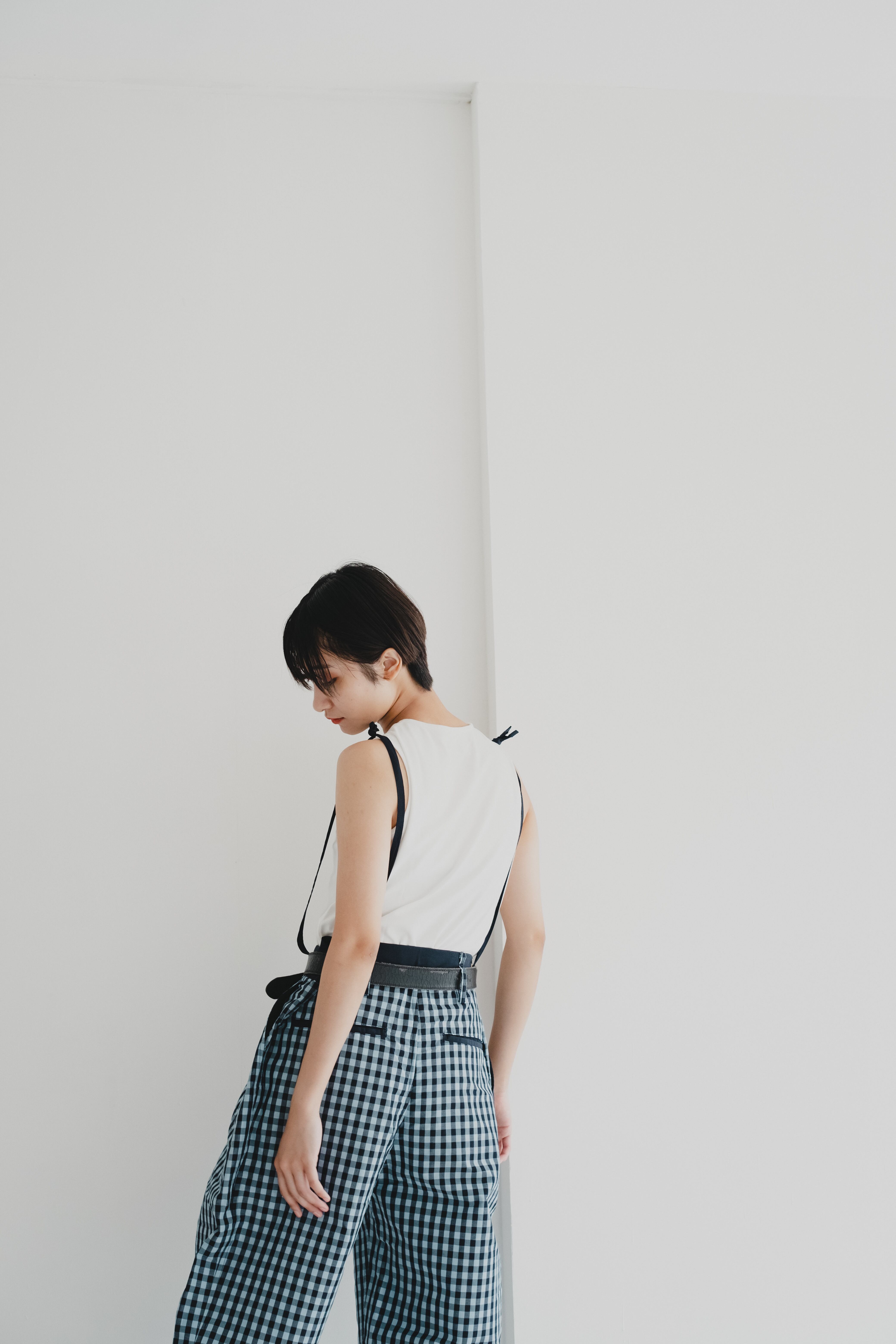 セットで付く共生地の紐をサスペンダーとして使用し着用したり、ウエストを絞ってベルトなしでも着用可能です。