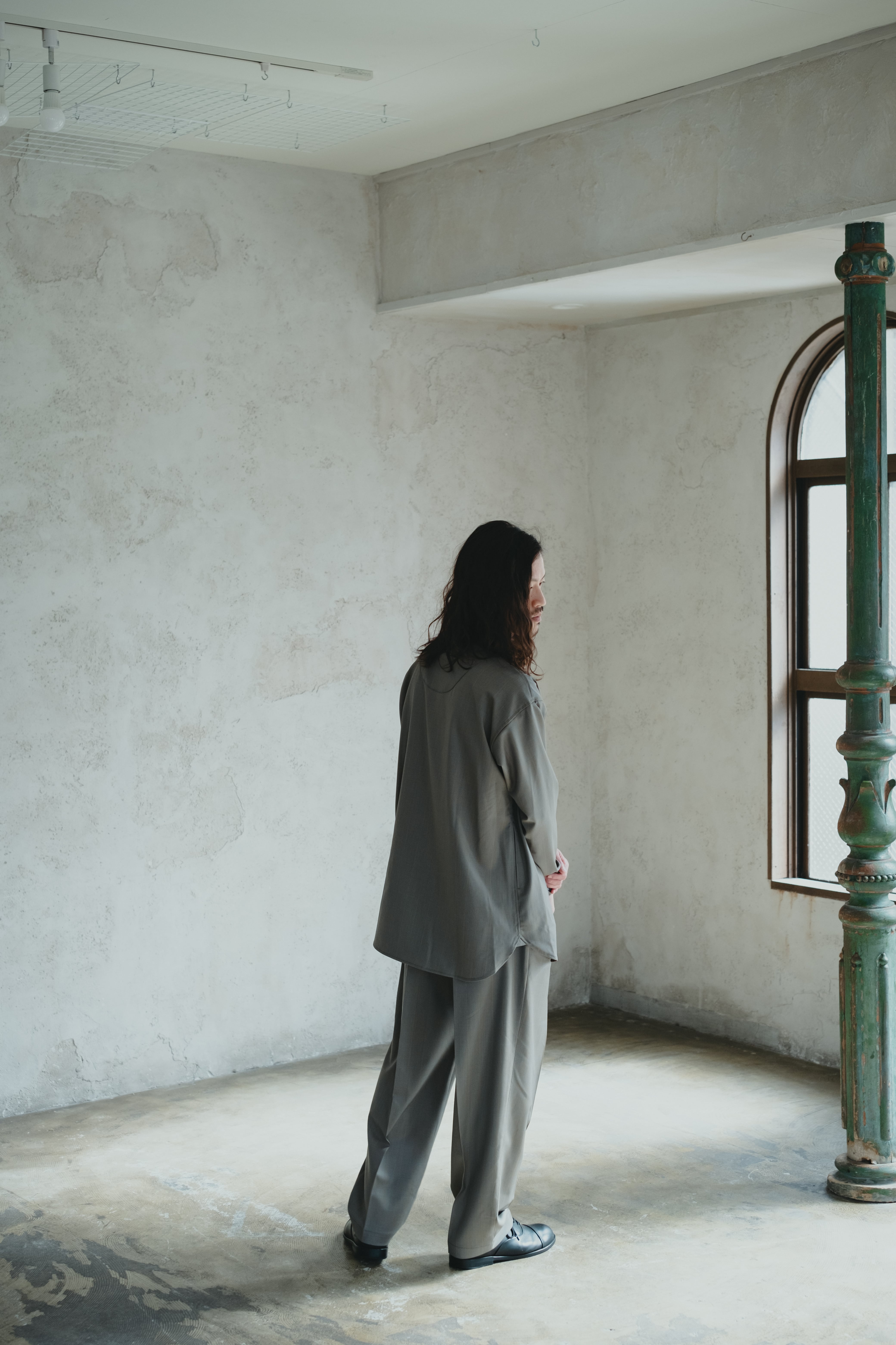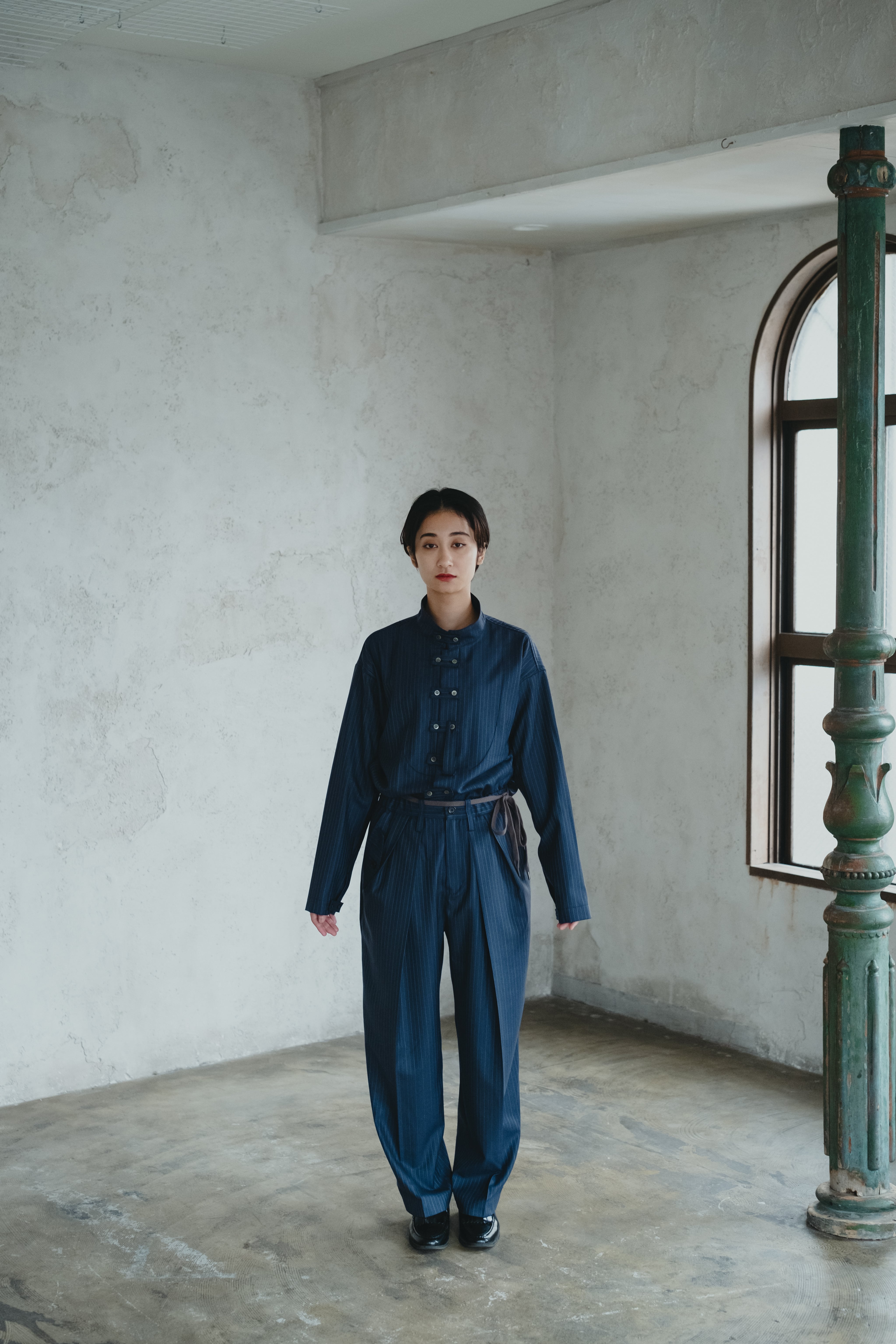 フロントにタックが左右二本ずつ 外向きに入っていて独特のシルエットが楽しめるパンツです。腰周りはゆったり、すそにかけて細くなるイメージです。タックは中縫いしていますのでアイロンがとれてきたらソレに沿って当てなおしてください。